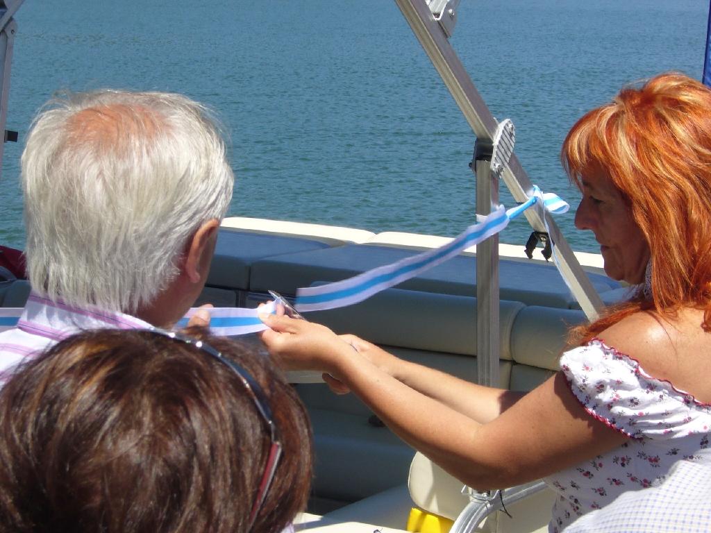 Inauguración del catamarán. Mª del Carmen Acuña rompiendo la cinta...