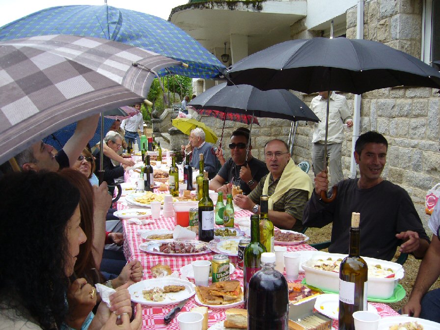 Buen humor, excelentes manjares y grandes amigos. En primera linea Lino Prada y Nacho Prada y familia. Al fondo Luis Prada y D. Eloy entre otros...