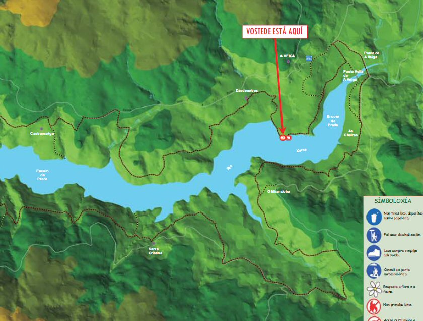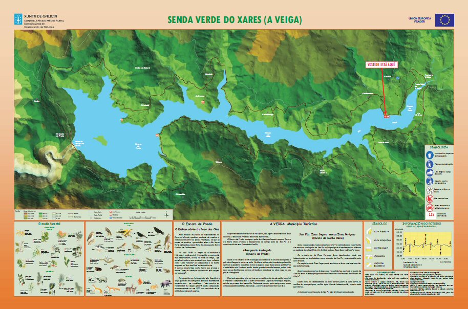 ... Panel de Embarcadeiro do Pozo das olas. Con máis detalle Os puntos marróns son a senda e os puntos blancos e negros son sendas alternativas. O trazado continuo blanco é a estrada de Sta Cristina a Prada. Flora da zona. Fauna da zona. Normas a seguir no sendeiro Saír.