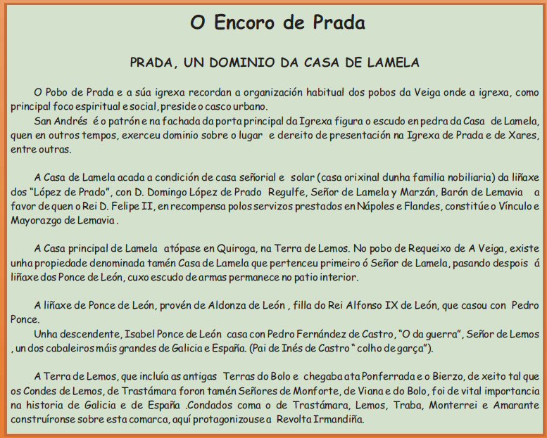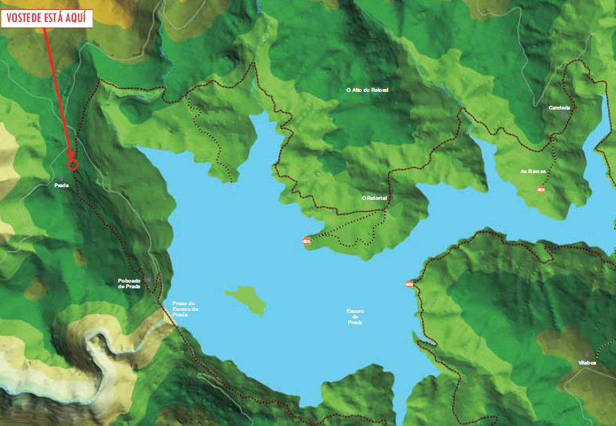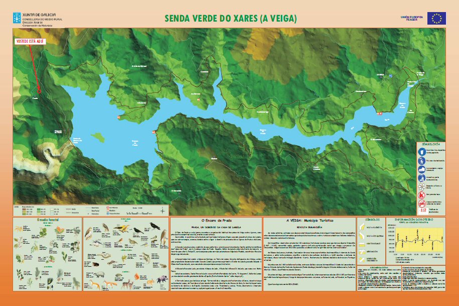 ... Panel de Prada Con máis detalle Os puntos marróns son a senda e os puntos blancos e negros son sendas alternativas. O trazado continuo blanco é a estrada de Sta Cristina a Prada. Flora da zona. Fauna da zona. Normas a seguir no sendeiro Saír.
