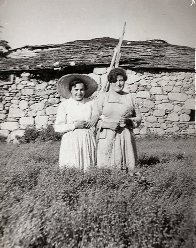 Julia e Carmen entre o liño, na cortiña de Julia.