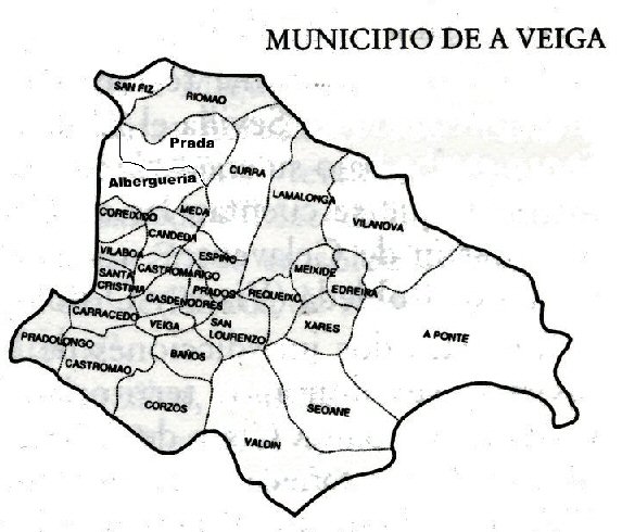 Antes do ano 1958 Alberguería estaba, como parroquia, situada así no mapa de A veiga.