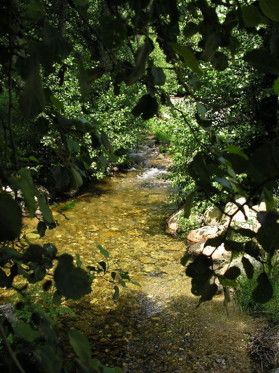 O río Xares con auga de xunio do 2004. Parece un regatiño. Non sería moi distinto pola zona de Alberguería sinon existise o encoro. As árbores a maioría son amieiros e freixas. A fotografía está sacada na zona de Xares.