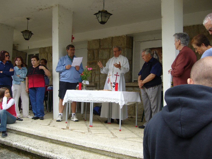 D. Eloy diciendo misa en el altar improvisado en el edificio antiguo de los ingenieros de Moncabril, hoy de Endesa y que nos cedió el Ayuntamiento de A Veiga, que tiene su uso y disfruto por 20 años.