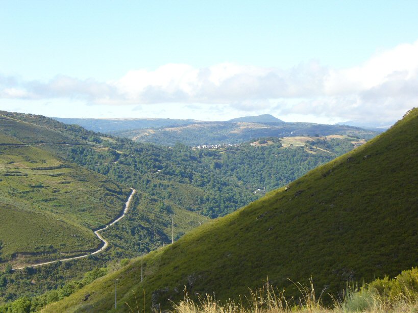 Camino de la fiesta. Prada desde la carretera que lleva a Riomao. Al fondo el Sto. Cristo de Prada.