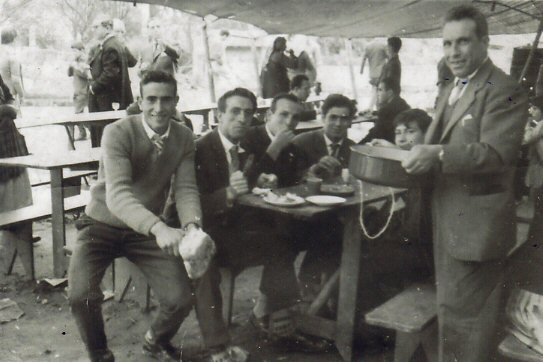 Dictino cos seus fillos e uns amigos. Seguramente unha festa xa que si hai pota...observo tamén un plato de pulpo e por suposto o pan e o viño...