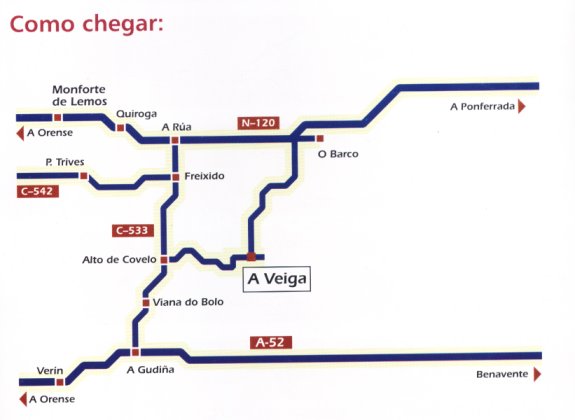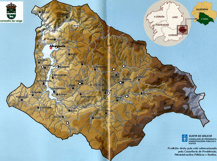 O Concello de A Veiga está na provincia de Ourense. Neste mapa vense os pobos máis importantes de A Veiga así como moitos detalles da súa xeografía..