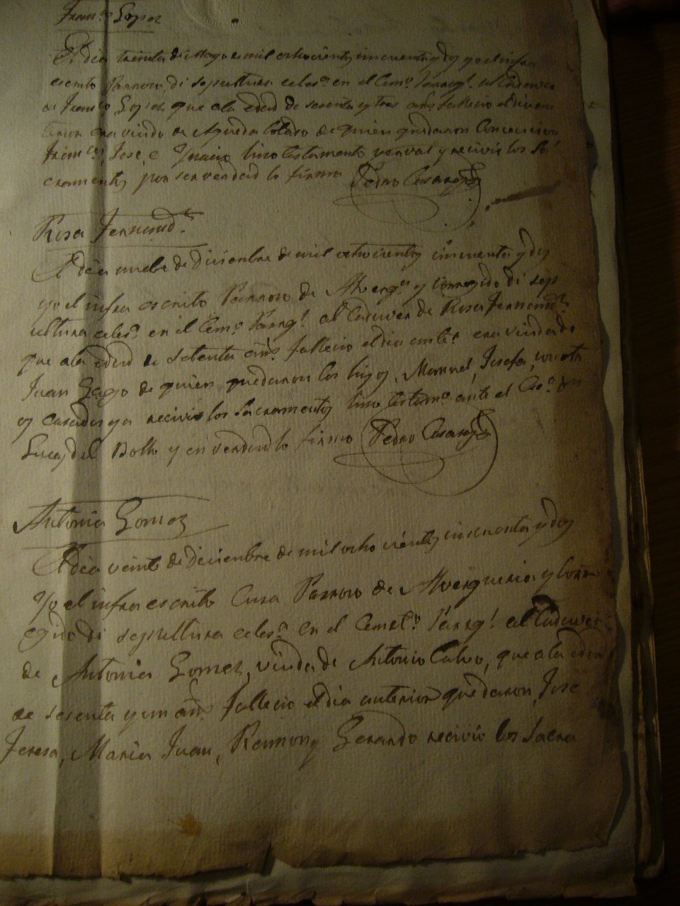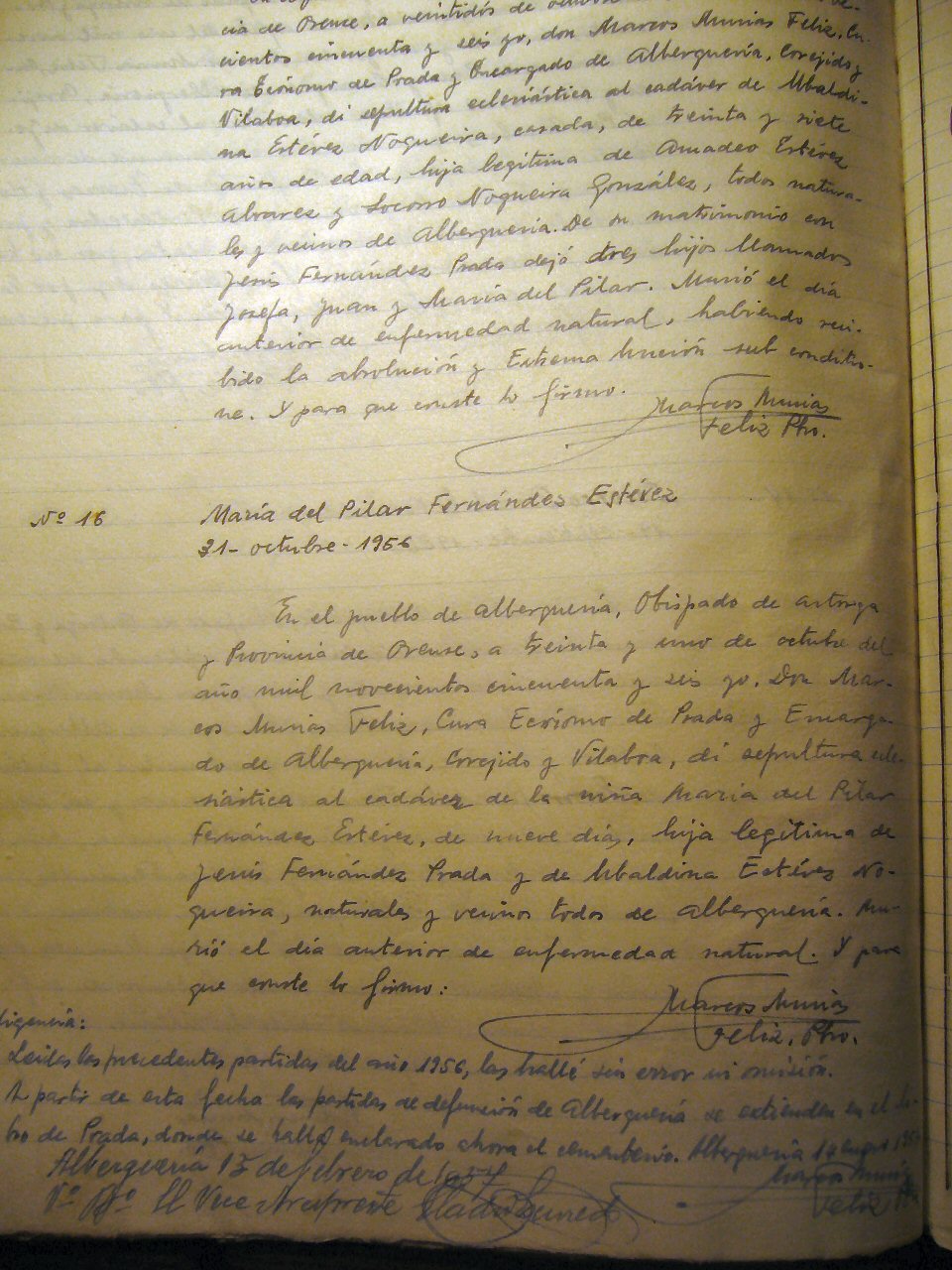 La última defunción apuntada en el libro fue la de la niña de nueve días, hija de Jesús Fernández Prada y Ubaldina Estévez. La niña se llamaba Mª del Pilar Fernández Estévez.