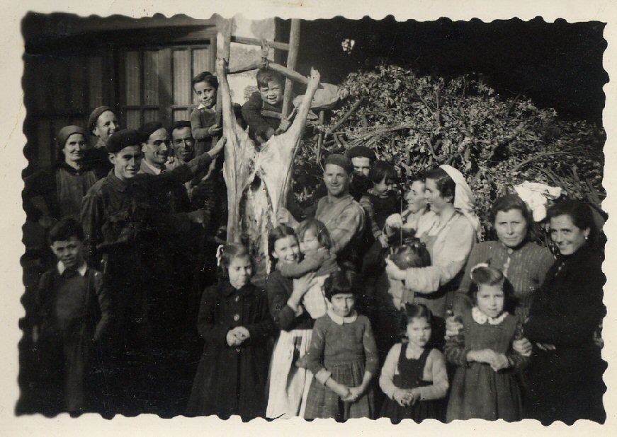 A fotografía é unha auténtica xoia. Trátase dun exemplo, neste caso coa familia da fotografía, dun acto máis que tiña lugar en moitas familias de Alberguería unha vez o ano. A matanza facíase en Alberguería como noutros moitos pobos de Galicia, era a acción de matar o porco para despois preparar e conservar a súa carne. Era sin dúbida todo un traballo familiar e de amigos pero tamén unha auténtica festa, sobre todo gastronómica. Pensar si non nos comenzos de todo o que non se vai conservar a sangue o fígado, os riles e un logo etc. . Logo o que se conservará, gracias a sala ou salados como a cachucha, os dentes, lacóns, touciños, xamóns, etc. E logo os embutidos como os chourizos... Repito, todo unha festa gastronómica... |