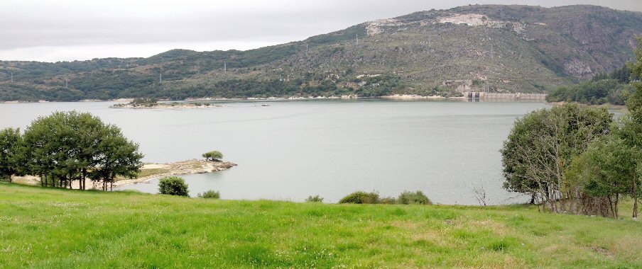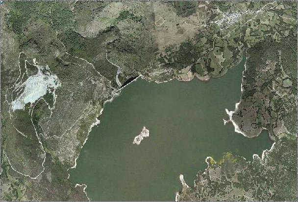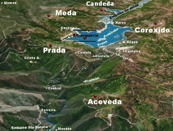 Na fotografía a vista do encoro de Prada, dende unha altura de 600 metros onde pode verse a Isla Preboubo e intuir onde estaba Alberguería. (Programa SIGPAC).