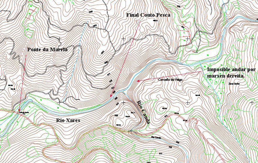 As fotografías están sacadas entre a Ponte da Marela que se ve a esquerda cruzando o río Xares e camiño de Seoane, río arriba, ata un km. por riba do río que se ve que é o río Canda, un afluente do Xares pola esquerda. Sempre pola marxen dereita do río xa que pola esquerda non se anda. A pesar de todo observar as curvas de nivel que son incribles en todo o tramo excepto o primeiro km. que é couto. Non cheguei os prados que se ven arriba a dereita, o final do cal, a seiscentos metros, desemboca o río Requeixo.