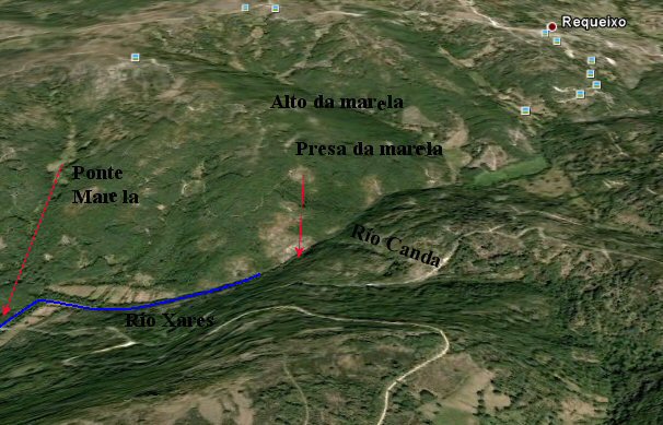 Este é o mapa sacado do Google Earth. Observar na Presa da Marela o macizo de pedras que se ve, tamén río arriba en tres sitios máis (ver unhas raias verticais). Eu non cheguei o prado que se ve por baixo de Requeixo. É moi malo de andar aparte que eu iba pescando de cando en vez, ou facendo que pescaba, xa que non as cheirei...O sitio é para ir acompañado e con moitas precaucións, é peligroso. por suposto si chove imposible con tanta pedra resbaladiza...