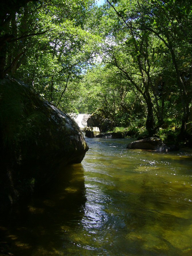 A presa da Marela. Unha presa duns tres o catro metro dificil de pasar xa que hai que ir polo rego da saída da presa, moi peligroso xa que ten moita profundidade e na cabeceira subir por una peña uns tres metros. Logo ten un 40 metros que vai un medio colgado a unha distancia considerable do río. Vamos...como para caer. O día estaba seco e tuven sorte...A paisaxe impresionante...a cor verde do río incrible...