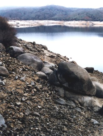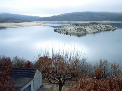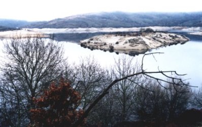 | Encoro no río Xares. Encoro de Prada dende a estrada o pasar Prada. | Encoro no río Xares. Ínsula de Preboubo, xa co encoro moito máis baixo que na primeira visita. | |