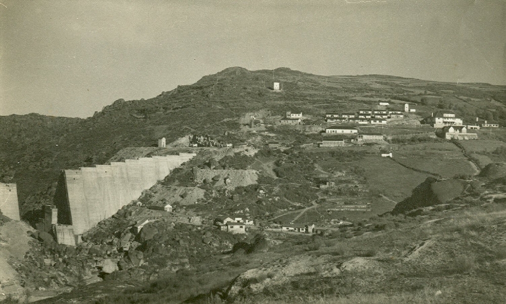 Vista sensacional da construción da presa de Prada. A dereita o alto de Preboubo. Xusto enfrente as casas que fixo Moncabril para facer o encoro. Por debaixo un prado do pai de Tiberio (hai unha casiña que isou o irmán de Tiberio como tasca para a presa). No fondo do prado poden verse uns trobos que eran do seu pai.